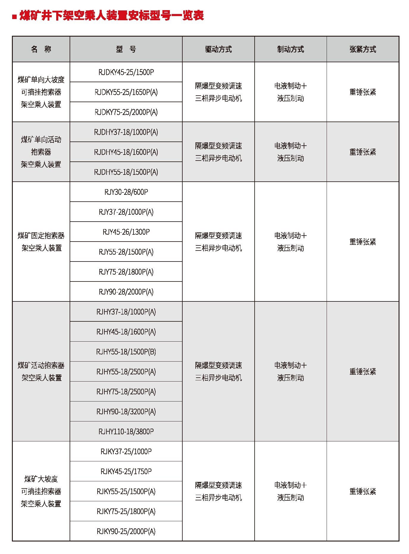 煤礦井下架空乘人裝置安標(biāo)型號一覽表